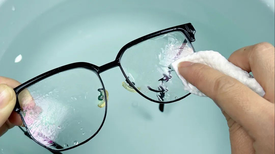 Trước tiên nên rửa sạch mắt kính dưới vòi nước để làm trôi hết bụi mịn bám trên bề mặt. Tiếp đó nhỏ một chút nước rửa chén lên cả hai tròng kính. Nước rửa chén có tác dụng làm sạch mà không gây kích ứng nên không làm hỏng lớp phủ bề mặt kính. Lưu ý là không nên sử dụng quá nhiều nước rửa chén, cũng không được sử dụng chất tẩy rửa có chứa axit hoặc có khả năng ăn mòn để lau kính.